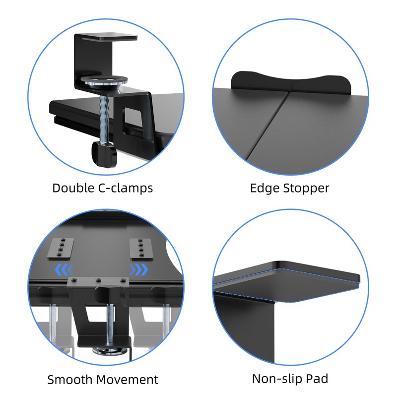 - Sturdy - Dual Steel C-clamps can tightly fix to your desk and holds up to 11lbs. Non-slip pads prevent your desk from scratching. Edge stopper can stop keyboard from falling when pushing back.
