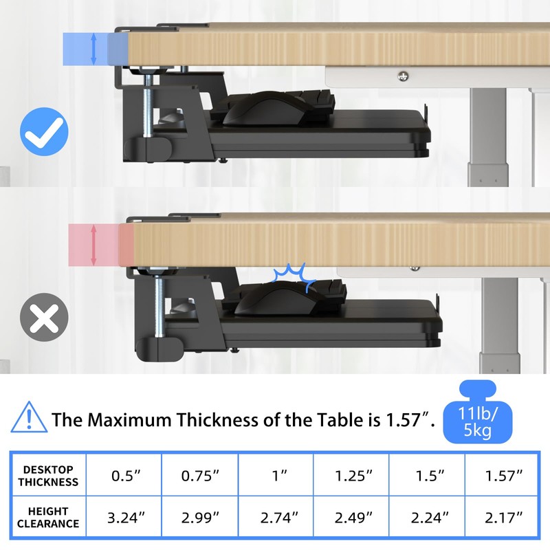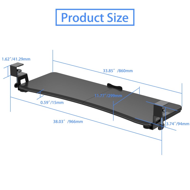 - Universal - This 34" (38" including clamps) x 11.8" under-desk keyboard tray holds your keyboard, mouse, and other small accessories below the desktop to add work space. Please not it does NOT fit if your desk thickness is over 1.57”.