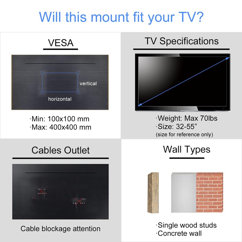 • Compatibility - Hold most 32-55" TVs up to 31.8kgs/70lbss, with 100x100mm-400x400mm backside mounting holes.