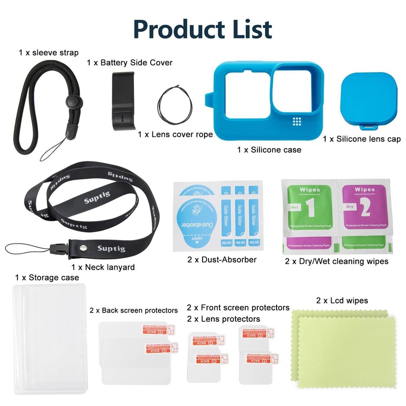 Suptig Schutzhülle, Silikonhülle, kompatibel mit GoPro Hero 12/Hero 11/Hero 10/Hero 9 Schwarz, Displayschutzfolie, Akku-Seitenabdeckung, Objektivdeckel, Schlüsselband-Zubehör-Set für Go Pro Hero