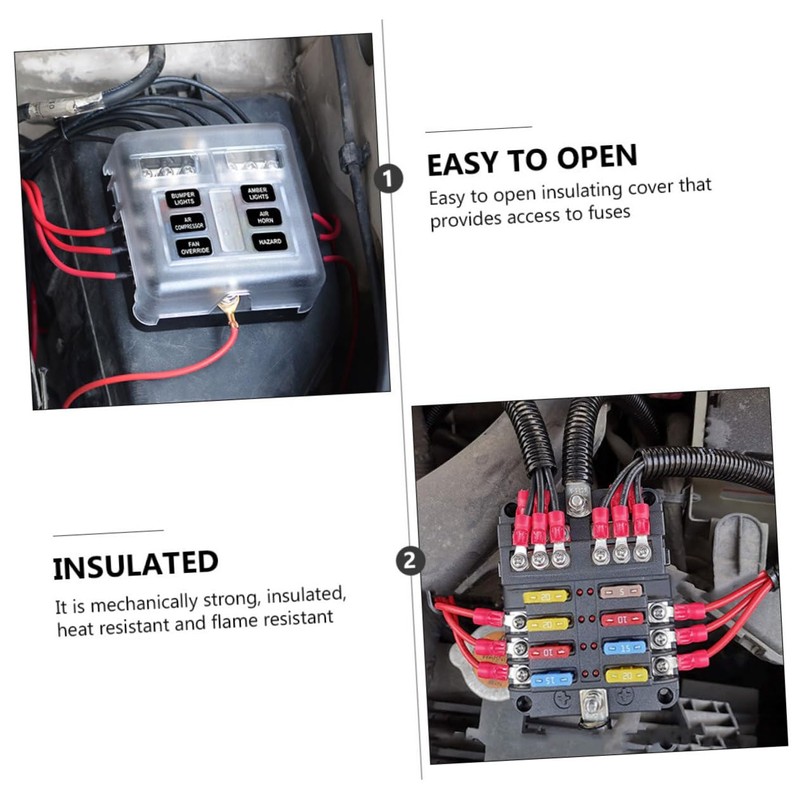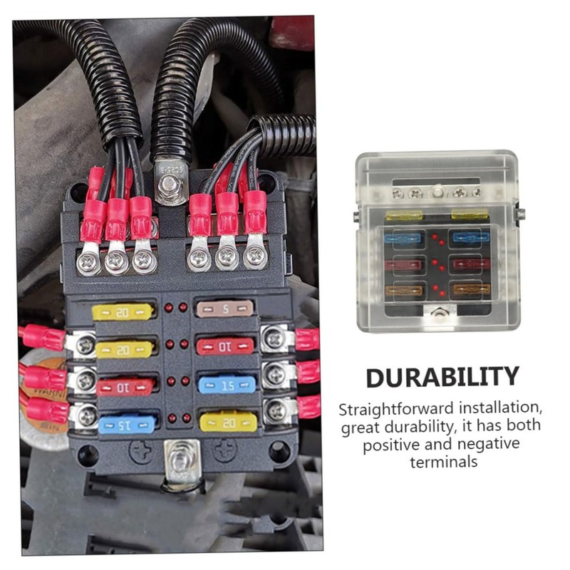 - Straightforward installation, great durability. It has both positive and negative terminals Car Fuse Box with Sticker.