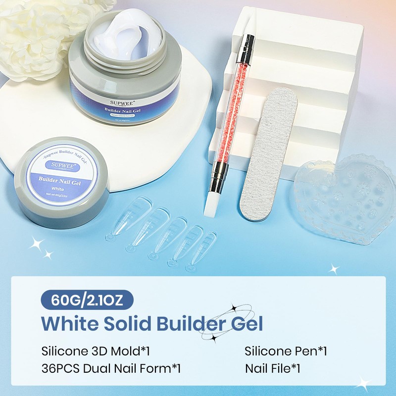 - SUPWEE Solid Builder Gel Set: This solid sculpture gel set contains 1 x 60 g white carved gel, 1 x double head silicone pen, 1 x nail polisher and 36 nail tips. Create stunning nail art designs at any time
