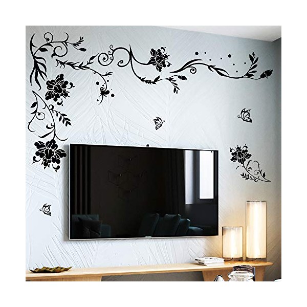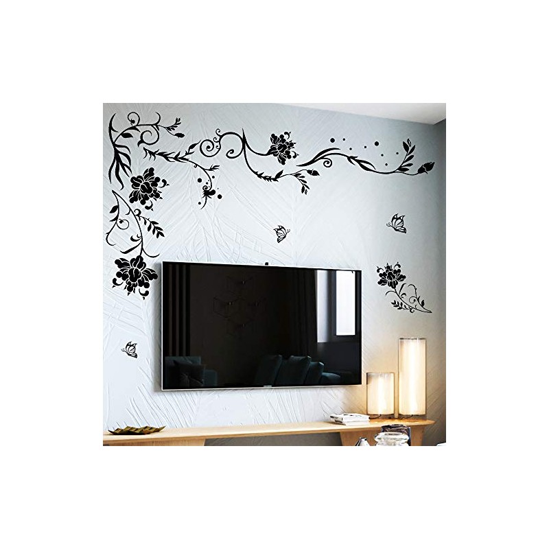 Supzone Flowers Vine Wall Decals Black Flower Wall Stickers Butterfly Floral Wall Decor Removable Vinyl DIY Home Wall Art Stickers for Bedroom Living Room Sofa Backdrop TV Wall Decoration