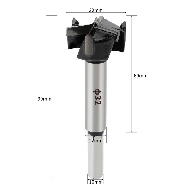 - Bohrdurchmesser: 32 mm,Sechskantschaft durchmesser: 10 mm,Bohrtiefe: 60 mm,Gesamtlänge: 90 mm.