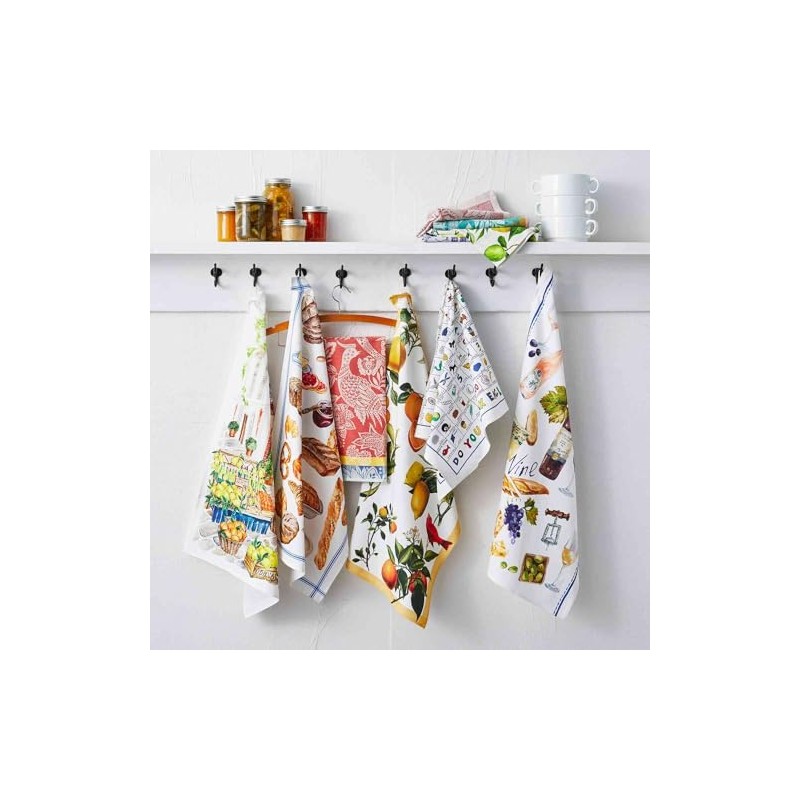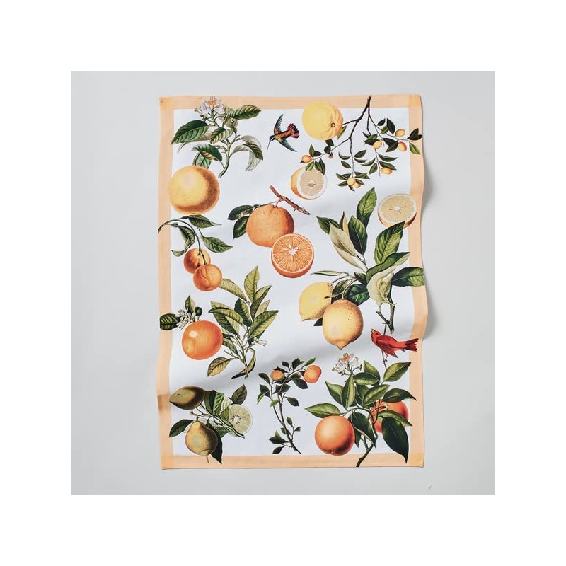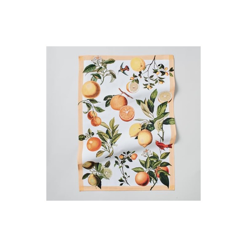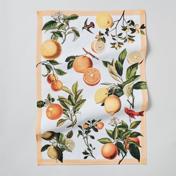 - Brighten up the kitchen with this oversized kitchen towel, featuring illustrations of oranges, lemon, linework and foliage