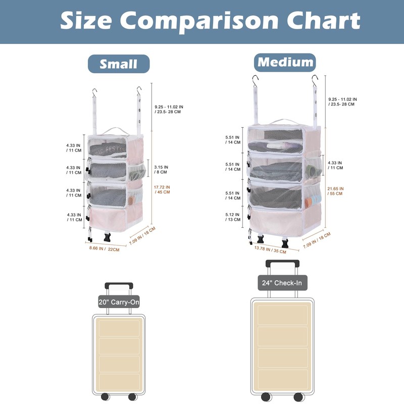 - Perfect Size: The expansion size of the carry-on hanging closet is 14.5×7×22.5in (36.8cm×17.8cm×57.2cm). The foldable size is 14.5×7×2in (22.9cm×17.8cm×5cm). The carry on closet compression can be easily put into luggage, or a suitcase.
