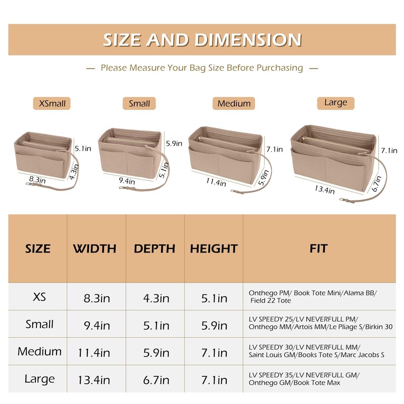 - Purchase Notes: Portable and compact purse perfect for any brand. Please kindly measure the interior Width, Depth, and Height of Your Handbag, then refer to our size chart and make a purchase. If you receive an item of the wrong size, please let us know, and we will provide you with a solution as soon as possible.