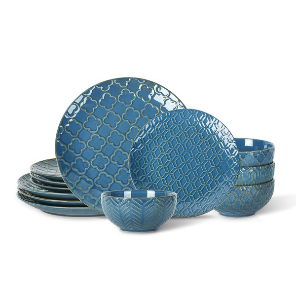 - EXQUISITE EMBOSSMENT PATTERNS: The 12-piece dinnerware set features four embossed patterns applied to each of the plates and bowls, creating an interesting visual appeal. They are four different geometric patterns that elevate the look of your kitchen and can be paired with any dinnerware.