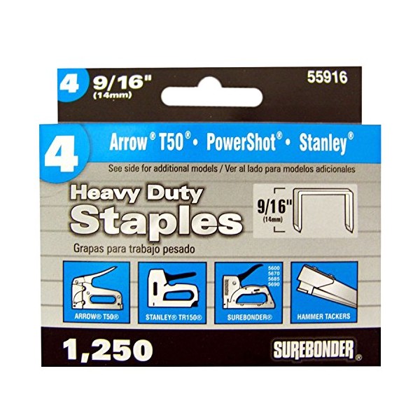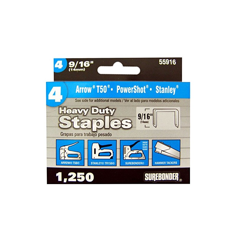 The popular 18G, Surebonder 55916, Heavy Duty 9/16\ Leg Length Staples, .417\" Heavy Duty Narrow Crown Staples (Arrow T50 Type) are a must for the homeowner, not only for its many uses, but it will accommodate many staplers and staple guns. For use in the following models: Surebonder 5690 Triggerfire, Surebonder 5600 HD 3-in-1 Stapler, Surebonder 5685 HD Professional/Contractor Gun, Surebonder 5800 HD Hammer Tacker, and Surebonder 9600A Pneumatic Narrow Crown Stapler. Other models include Arrow T50, ET-50, ETC50, ETF50P, T55; Stanley PHT150, TR100, TRE500, TR100HL, TR200, TR60; Powerfast (Swingline) 31690, 31890; Ace Hardware 2014413; Craftsman 68514, 68517, 68492, 68515; Black & Decker 5700, 2000E, 3000E, and 4000E. There are 1,250 staples in a box."