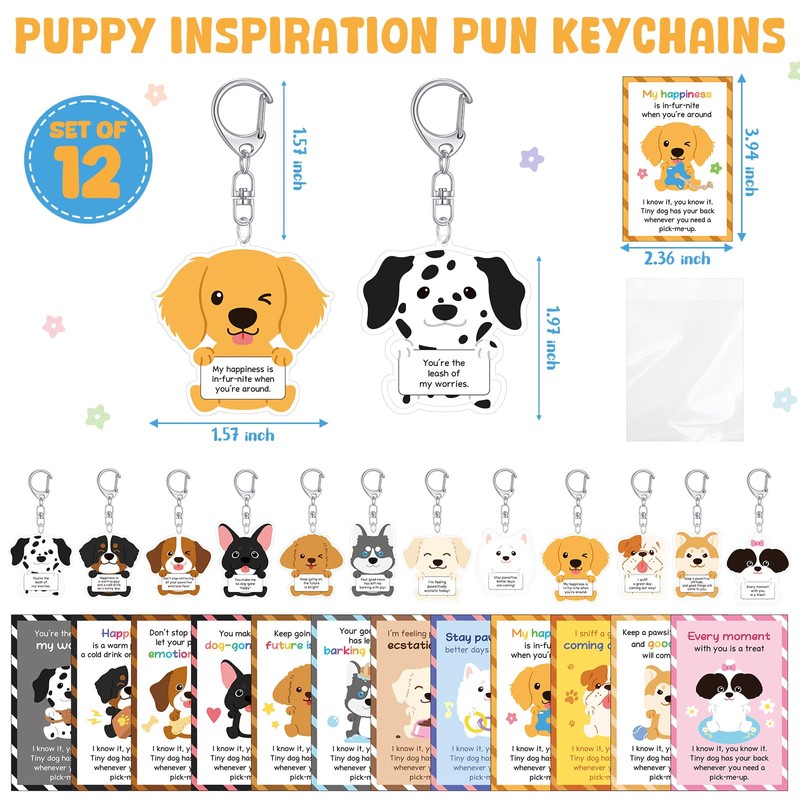 • Generous Packaging: you will receive with a total of 12 sets of puppy pattern emotional Support gifts, including 12 different styles of puppy acrylic keychains, 12 puppy pun inspirational cards with 12 different styles, and 12 transparent packaging bags designed, sufficient quantity and diverse styles, easily meet your gift needs