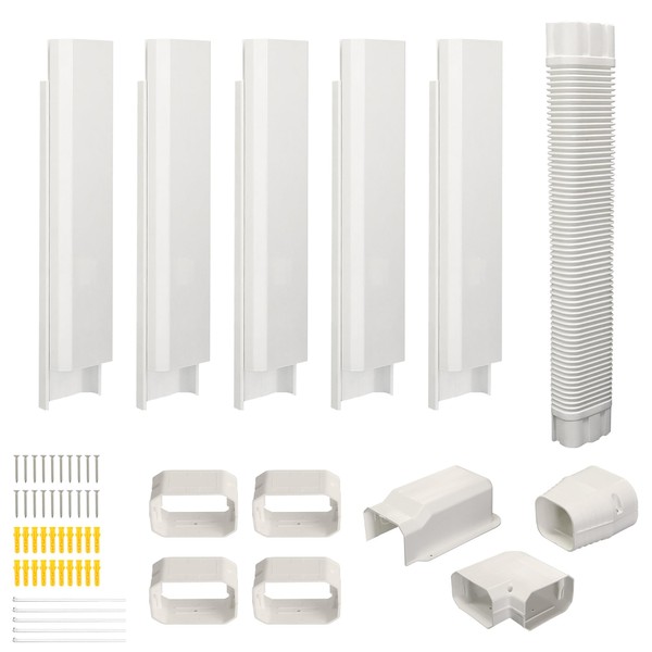 - Package Includes: The mini split line set cover kit is 4" x 10 feet, including 5 x straight ducts (16.9"), 4 x coupling, 1 x wall cover, 1 x reducer end cap, 1x 90° flat elbow, 1 x flexible duct, screws, and more. Suitable for mini splits, central ACs, heat pumps, and more