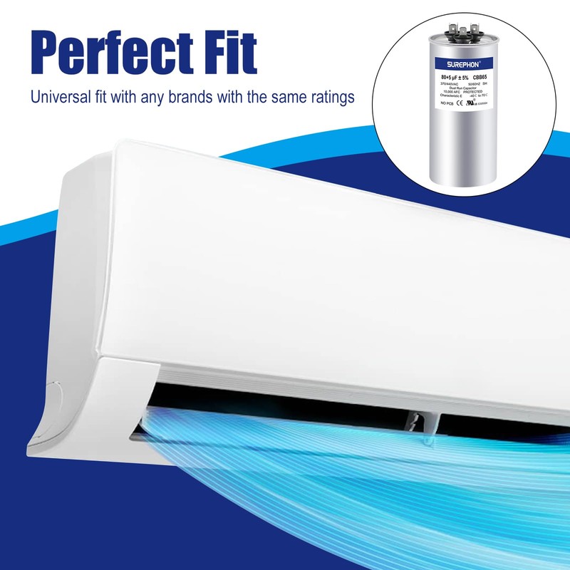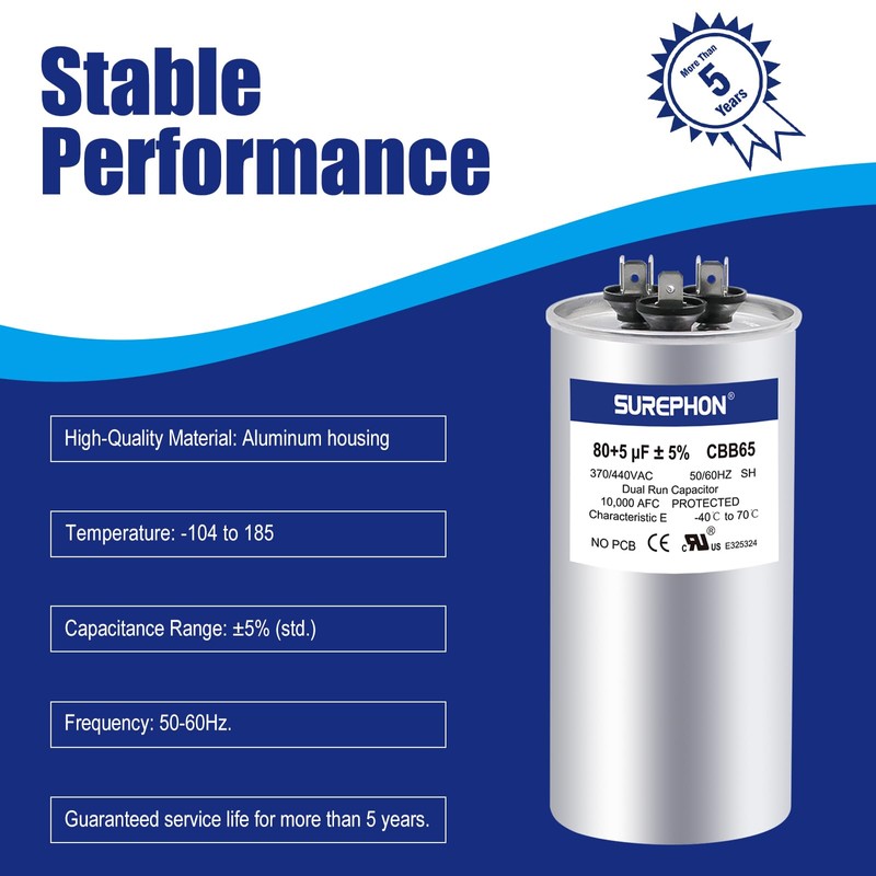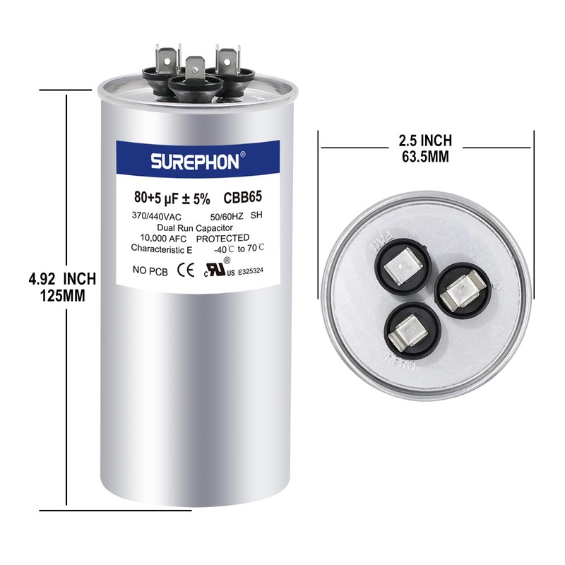 - SUREPHON CBB65 80+5uf ±5% ac capacitor replacement for 370/440 Volt capacitors, A Class, 10000 AFC.