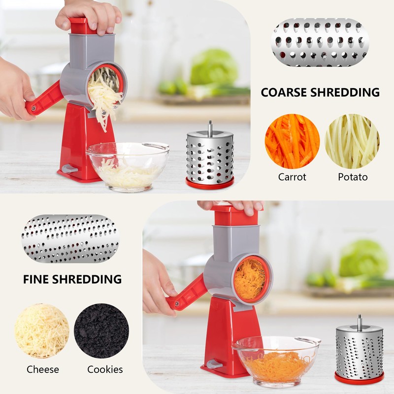 - Efficient and Time-Saving: Thanks to the rotary design that allows for quick and effortless grating, slicing, and shredding of cheese, vegetables, nuts, and more. Shred ingredients up to 12 times faster than traditional methods.