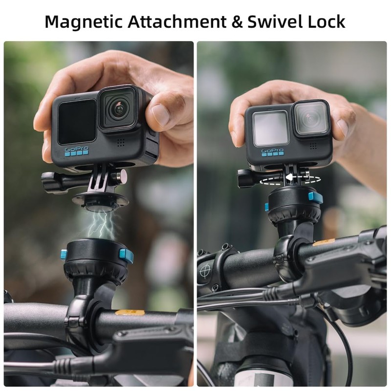 - Magnetic attachment and rotary lock: magnetic bicycle handlebar mount is designed with adsorption mounting and push-lock design for quick installation. Twist to unlock for disassembly. The assembly and disassembly of the sports camera can be done with one hand, convenient and fast.