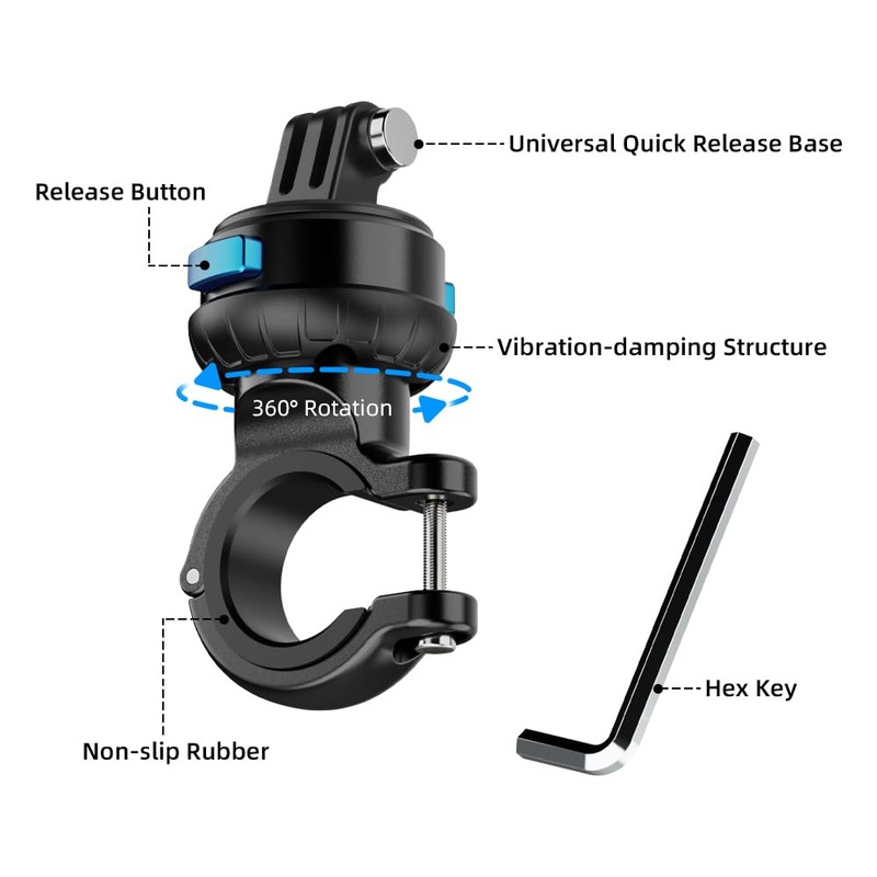 - Vibration Dampening Structure & 360 Adjustment The design of the shock absorbing part in the middle of the motorcycle clamp mount prevents the sensitive components of the camera from being damaged by the strong vibrations of movement. The shock absorbing part can be manually rotated 360° between it and the floor to achieve any desired shooting direction.