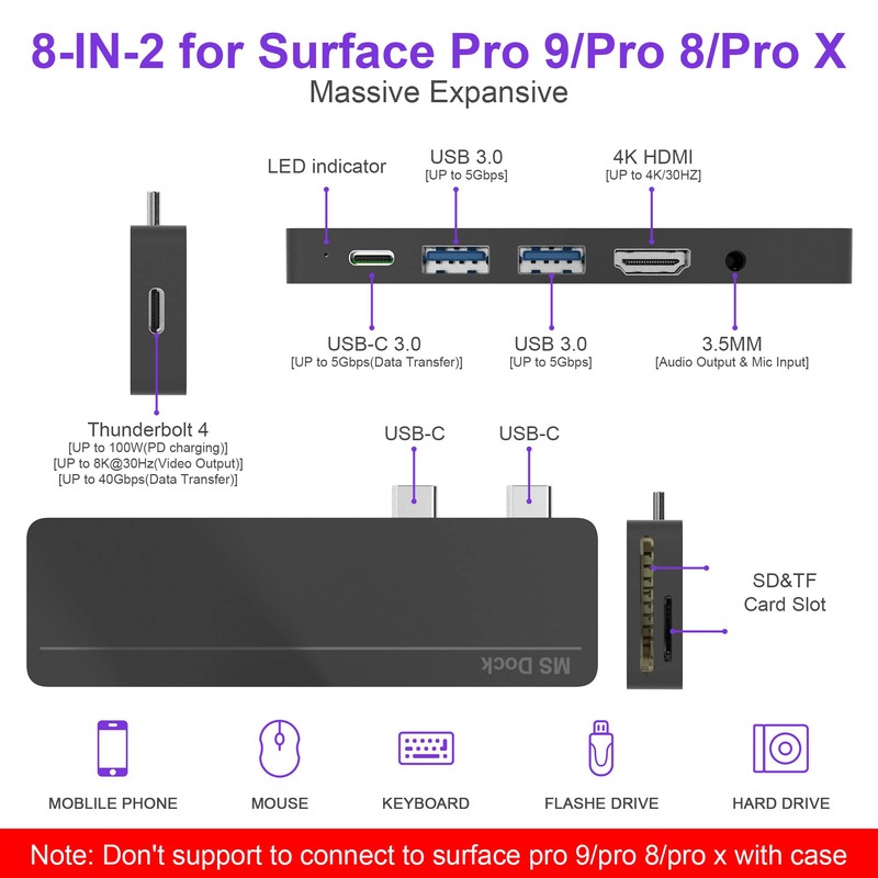 - Specially developed for Surface Pro 9/Pro 8/Pro X: The Surface Pro 8 docking station has been specially developed for Microsoft Surface Pro 9, Surface Pro 8 and Surface Pro X, and transforms the 2 USB C connections into 8 ports: 1 x 4K HDMI port, 1 x 100 W Thunerbolt 4 port (video + data transfer 40 Gbps + PD charging), 2 x USB. 3.0 connection Type-C (5Gbps), 1 x SD card slot, 1 x TF (Micro SD) card slot, 3.5mm audio/microphone jack. (*Note: Only compatible with Microsoft Surface Pro 8 and Surface Pro X, please do not use protective case.)