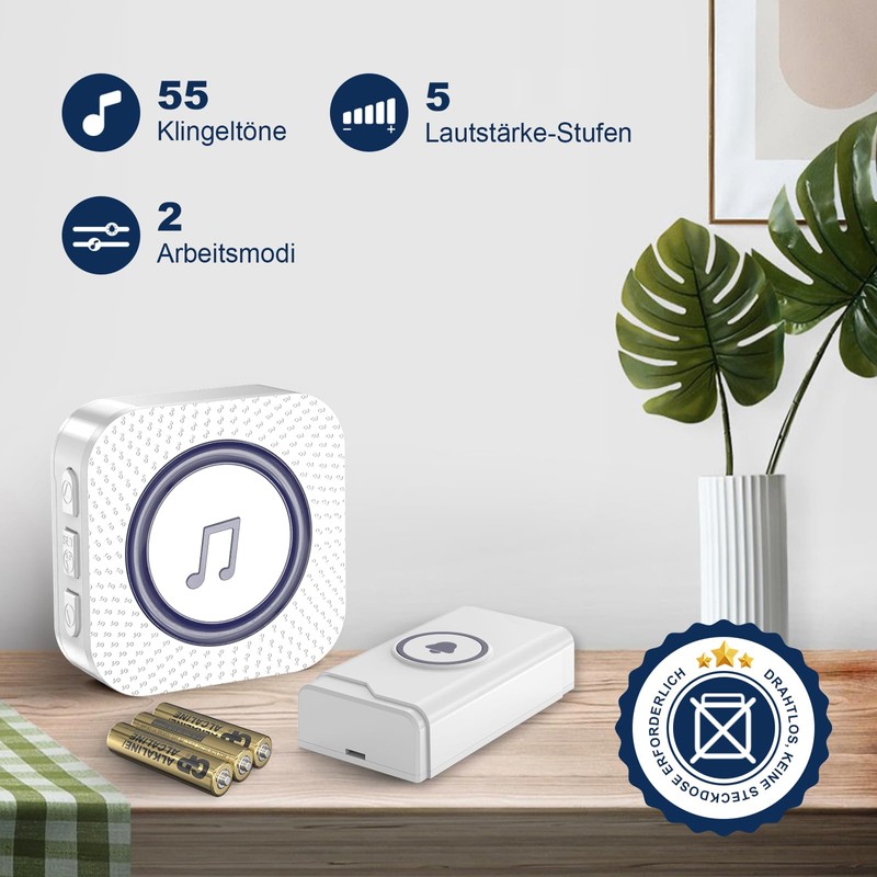 - 【Individueller Klang, Flexible Modi】Genießen Sie präzise Kontrolle mit 5 Lautstärkestufen bis zu 110 dB, ideal für Hörgeschädigte oder Senioren. Wechseln Sie einfach zwischen LED nur oder LED + Klingelmodus und wählen Sie aus 55 Melodien für individuelle Benachrichtigungen. Ihre letzten Einstellungen werden für ununterbrochene Bequemlichkeit gespeichert.