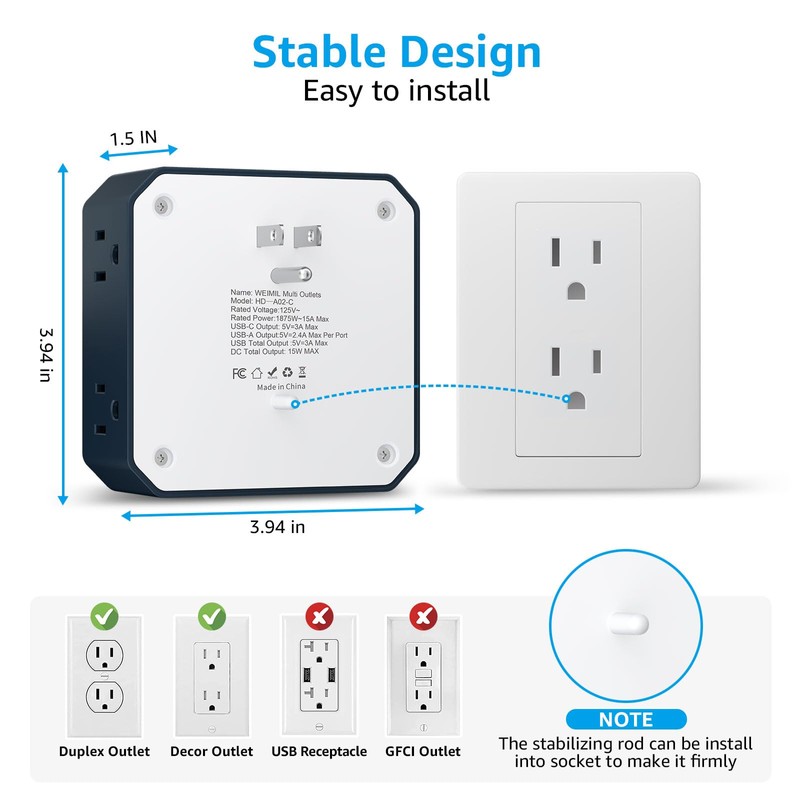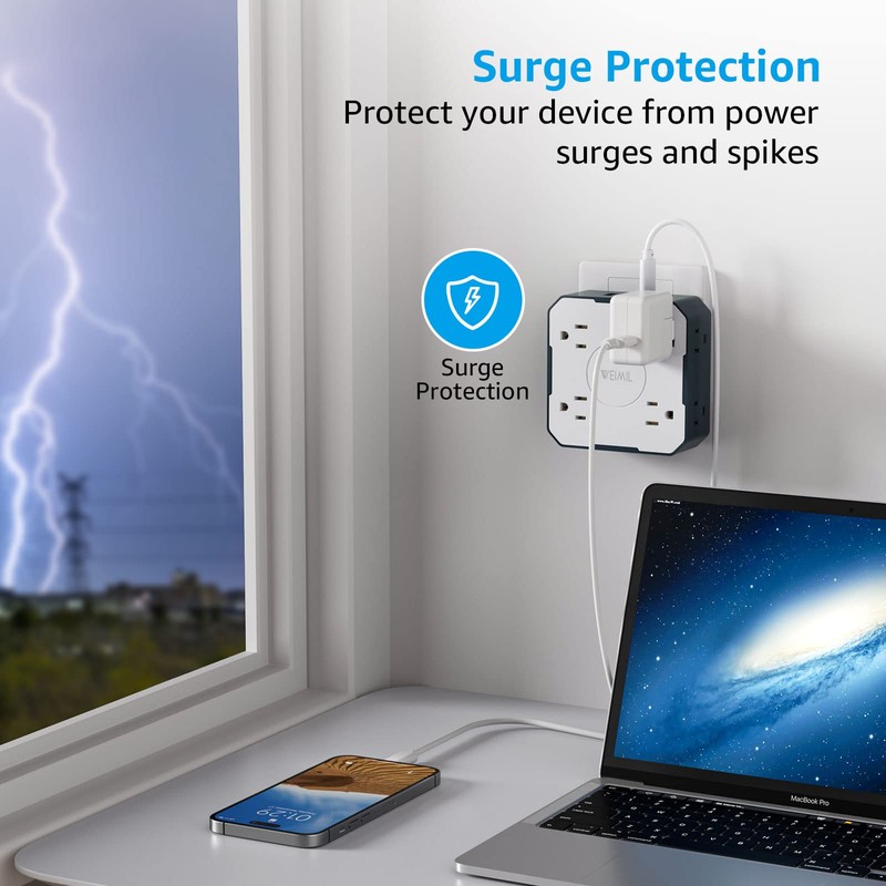 - 【11 in 1 USB Wall Outlet Extender】The multi outlet wall plug with 8 AC outlet adapter (3 side, 15A/125V/1875W) and 3 USB charging ports (1 USB C, total output DC 5V/3A), can charge up to 11 devices simultaneously. This outlet splitter with usb ports would charge your cellphone, laptop, tablet, watch without a variety of converters