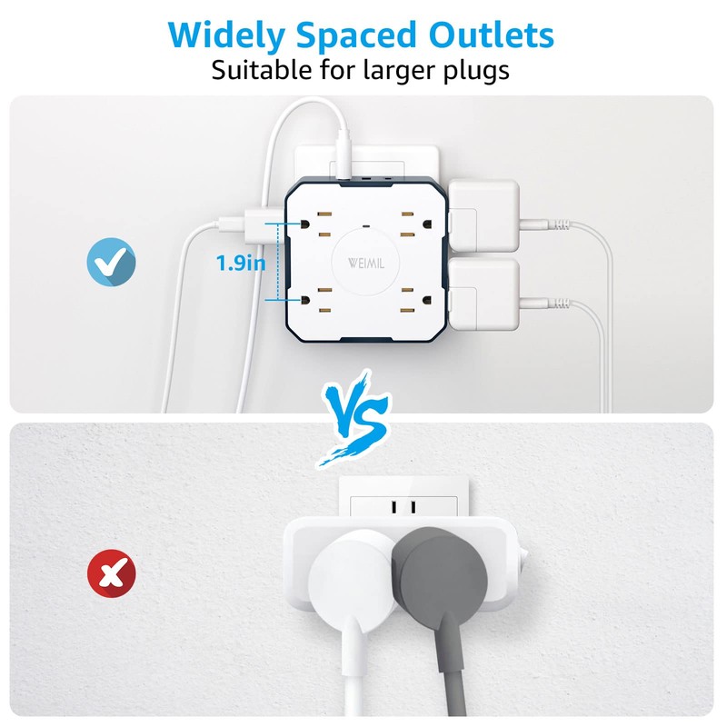 - 【Widely Space Outlets】The wall outlet extender with 3-side design and 8 AC outlets with wide space in between, makes it enough to fit larger adapters without blocking and suitable for all kinds of equipment.