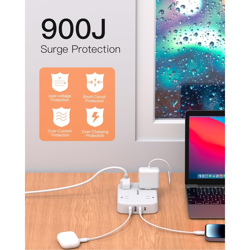 - 【Surge Protection & Overload Protection】900 Joules surge protector with overload protection protects your electrical appliances from lighting, surges, or spikes. It will automatically cut power to protect connected devices when a voltage surge is overwhelming.