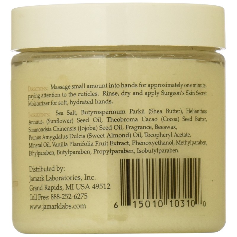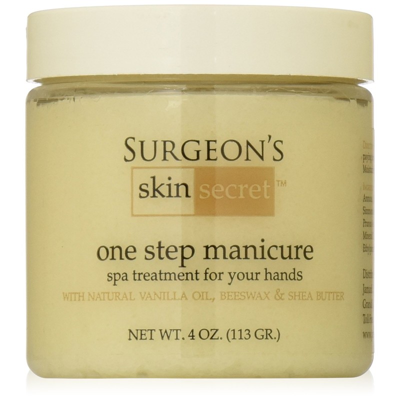 Are you tired of torn, dry and bleeding cuticles? AŠFed up with hands and feet that feel like sand paper? AŠWish you could send them to a spa for a week of RandR? As fed Surgeons Skin Secret One Step Manicure a try. As this unique formula of sea salt, beeswax, shea butter and botanical oils will leave your skin gently exfoliated and feeling smooth as silk after only one use. A Features of this exclusive formula: smoothes and moisturizes, helps heal dry splitting cuticles and heels, has a light fragrance in either lemon or vanilla, fast and easy to use. As In only 60 seconds, your hands and feet will feel refreshed and ready to take on the day. Follow up your One Step Manicure with Surgeons Skin Secret Beeswax Moisturizer for long lasting protection.