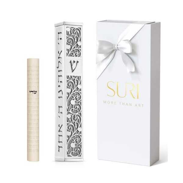 SURI Silver Modern Mezuzah Case with Scroll and a Gift Box, Gray Self Stick Mezuzah with Scroll for Door, Jewish Mezuza 5” Waterproof for Outdoors. Home Blessing and Protection Cover