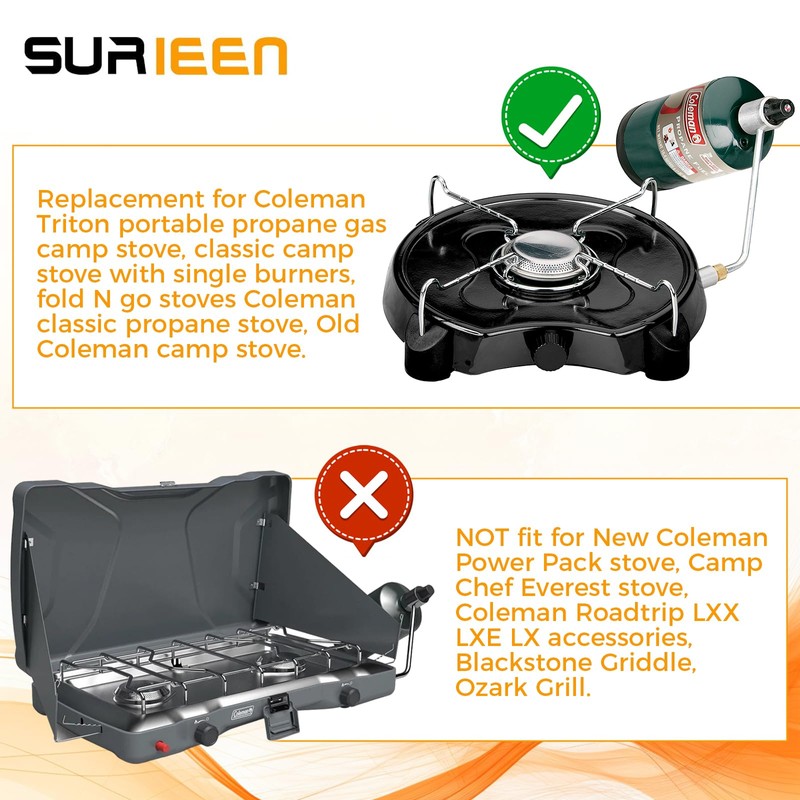 - √【APPLICATION】---This pressure regulator with 3 feet extension hose ONLY replacement for Coleman Triton portable propane gas camp stove, classic camp stove with 2 burners, fold N go stoves Coleman classic propane stove. (NOT replacement for coleman roadtrip LXX LXE LX accessories, Blackstone Griddle, Jetboil Genesis).