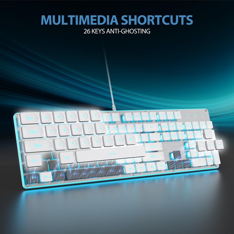 surmen G1000 Backlit White Quiet Office Keyboard Full Size 104 Keys with Metal Panel, Silent Membrane USB Wired Gaming Keyboard for PC, Desktop, Computer(White)