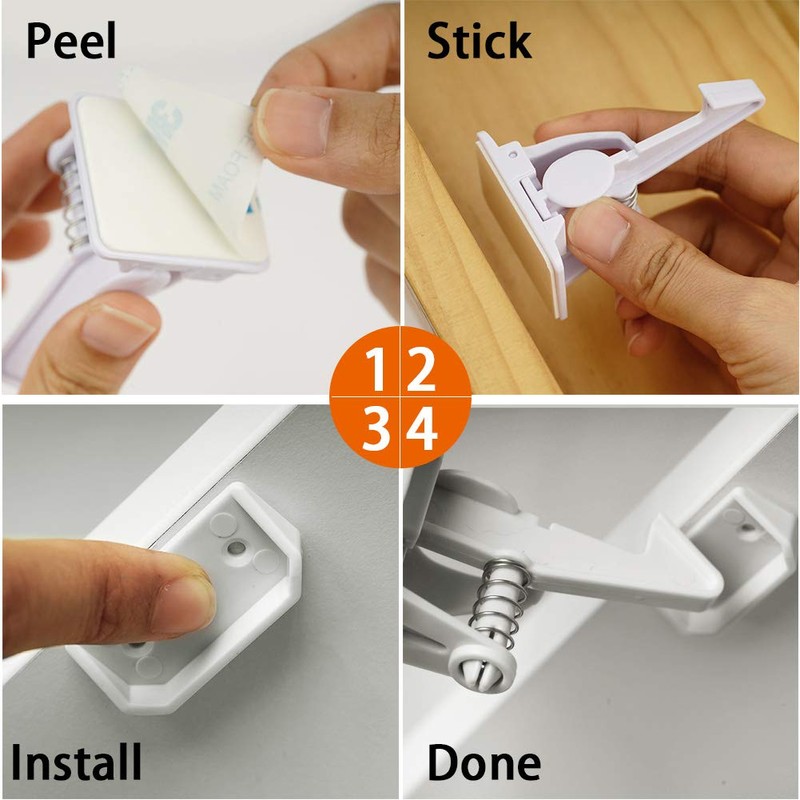 - Easy to install: no tools, no drilling installation, our child safety locks are equipped with adhesives, buckles and screws and can be attached to your cabinets in seconds.