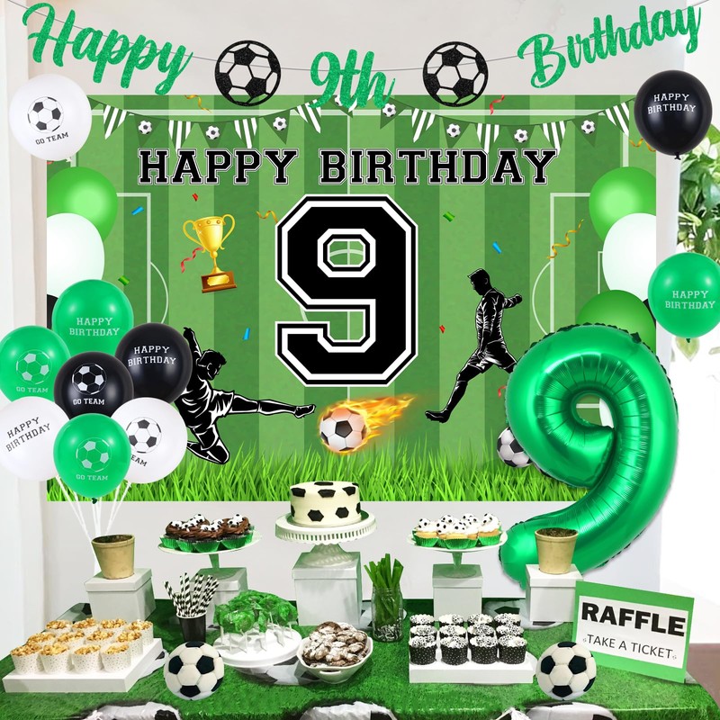 - Green and White Football 9th Birthday Decorations for Boys: You will receive 12 latex balloons 12 inches(4 green, 4 black, 4 white), 1 “HAPPY 9th BIRTHDAY” banner, 1 “HAPPY BIRTHDAY 9” backdrop 3.3*4.9ft, 1 number 9 foil balloons 32 inches, 2 white ribbons.