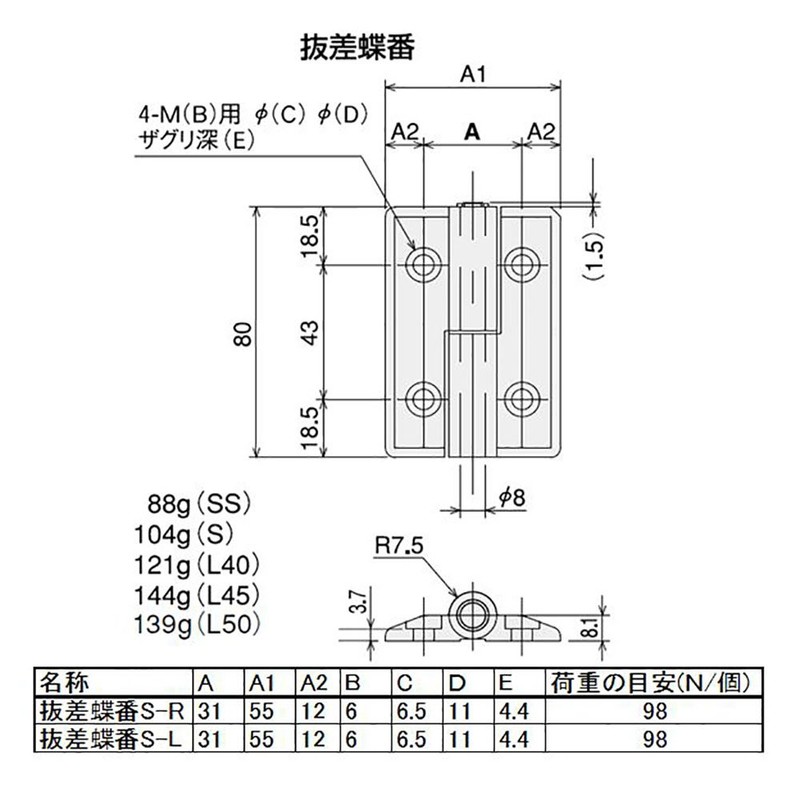 SUS (esuyuuesu) 抜差 Hinges, Small (Melamine), 4 Pack , sliver