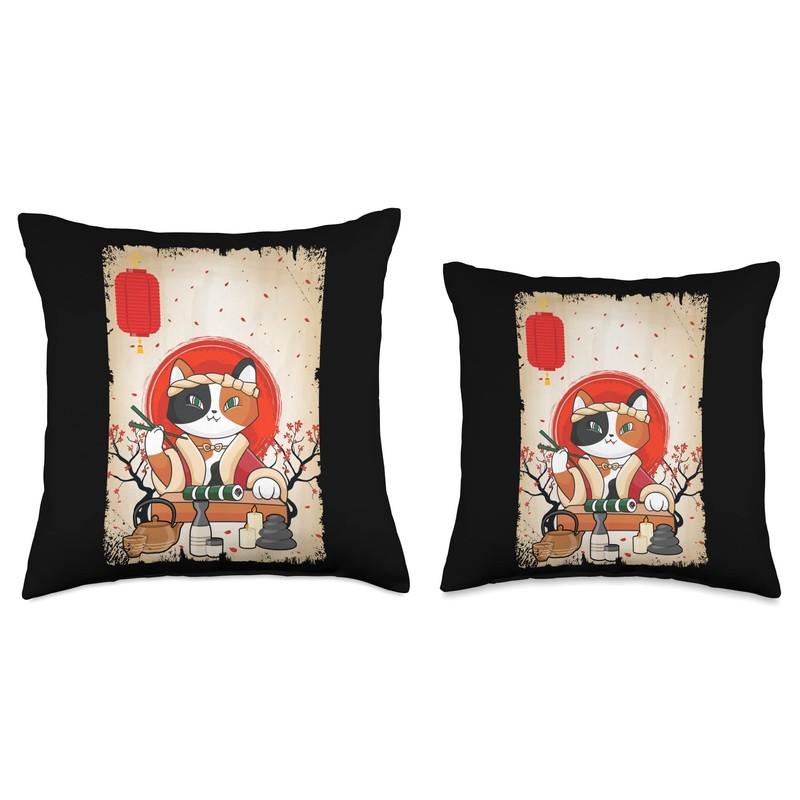 Sushi Cat Japanese Food Sakura Japanese Cat Sushi Cherry Blossom Throw Pillow, 18x18, Multicolor