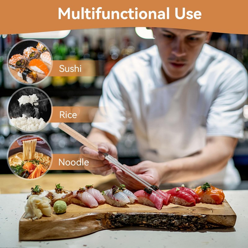 - 🥢 Balanced Dimensions: The combination of wooden handles and stainless steel sushi chopsticks is moderate in length and light. The perfect combination of weight and length makes it comfortable and convenient to use.