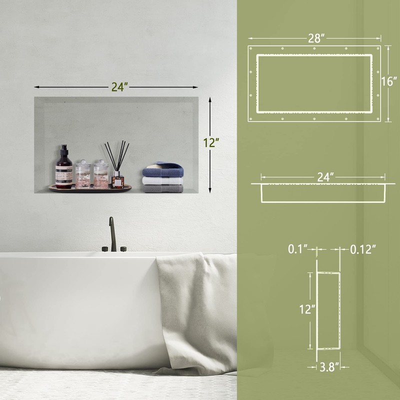 - ✅ 16" x 28" shower niche can convenient storage your private belongings in the bathroom. The wash table is assisted by an niche, so that the table top is no longer full of bottles and cans. The niche cube can be used for storage toilet paper, and can also be store aside the shower area to storage bath toiletries.