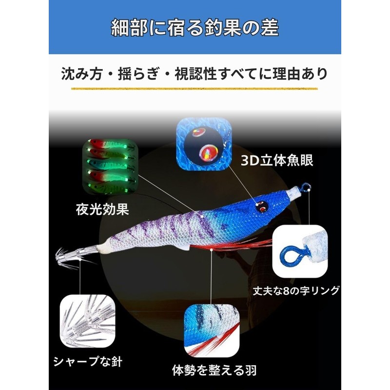 - [Product Specifications] Set Contents: 3 / 4 / 5 / 6 / 8 / 10 piece set (*Color configuration may vary depending on the number of sets). Total Length: Approx. 4.3 inches (11 cm). Weight: Approx. 0.2 oz (7 Suitable for fish species: Kenthaki, Aoli Squid, Yarika, Sullumaika, Smoker, Octopus, etc. Compatible rigs: cycamatal, oMorig, dropper and torso Uses: Boat fishing, embankment fishing, surf fishing, night fishing, daytime fishing, etc. Please be aware that there may be slight differences in the sizes as this is a guide. We have done our best to make our product photos as close to the actual product as possible, but the actual color of the product may differ depending on your monitor settings, lighting in your room, etc. As this is an overseas product, there may be some slight differences in the details of the product compared to those made in Japan. Please be aware of this in advance. The plastic case in the package may be damaged, but this does not affect the product. Please acknowledge