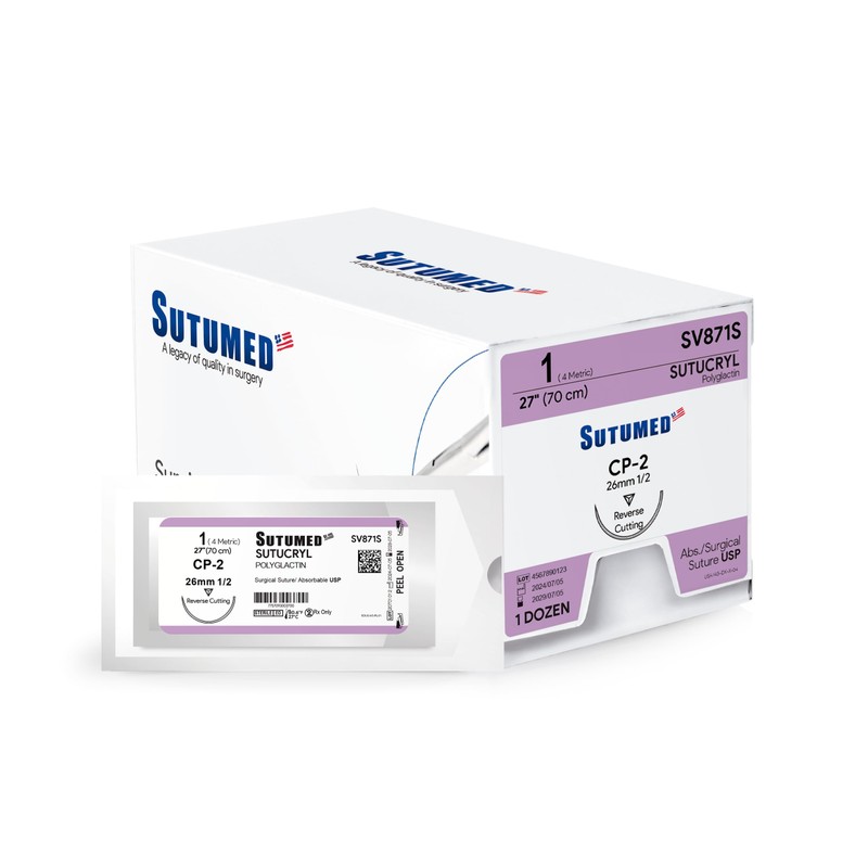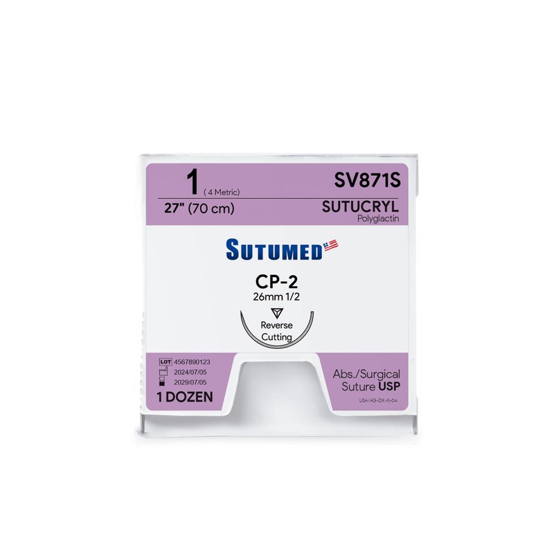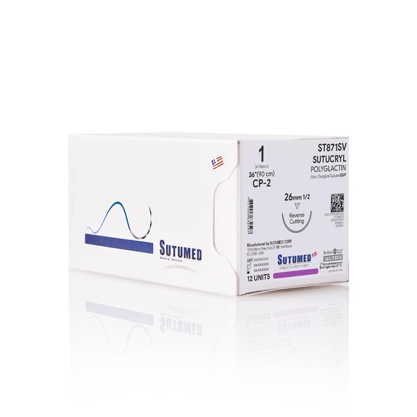 Sutumed SUTUCRYL Absorbable Polyglactin Surgical Suture USP Size 1, 1/2 26mm Reverse Cutting Needle, 28 Inches (70 cm), 12 Count