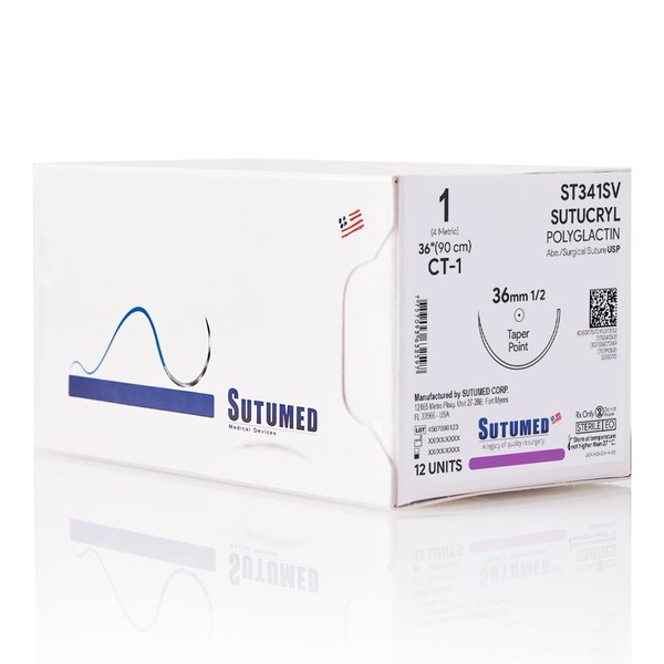 Sutumed SUTUCRYL Absorbable Polyglactin Surgical Suture USP Size 1, 1/2 36mm Taper Point Needle, 28 Inches (70 cm), 12 Count
