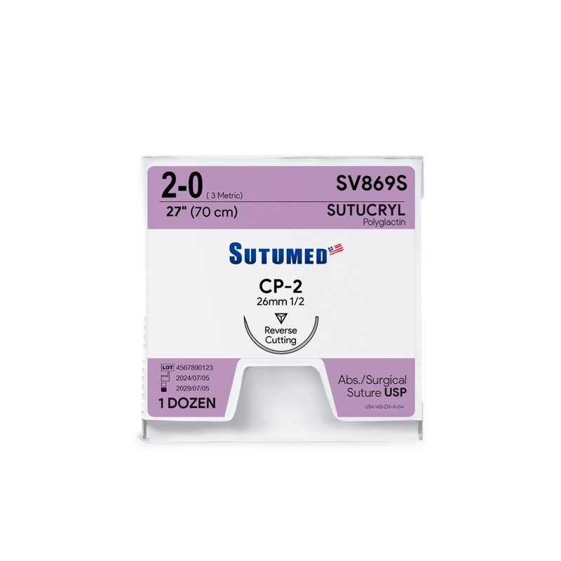 Sutumed SUTUCRYL Absorbable Polyglactin Surgical Suture USP Size 2-0, 1/2 26mm Reverse Cutting Needle, 28 Inches (70 cm), 12 Count