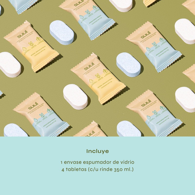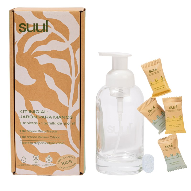 - RELLENABLE Y ECOLÓGICO: Compralo una vez y rellenalo para siempre con las tabletas de Suul. Este Kit inicial incluye: 1 envase espumador de vidrio y 4 tabletas de jabón (2 aroma verano cítrico y 2 aroma brisa fresca). Cuando se terminen únicamente compra tus refills. (Cada tableta rinde 1 envase lleno 350 ml.)