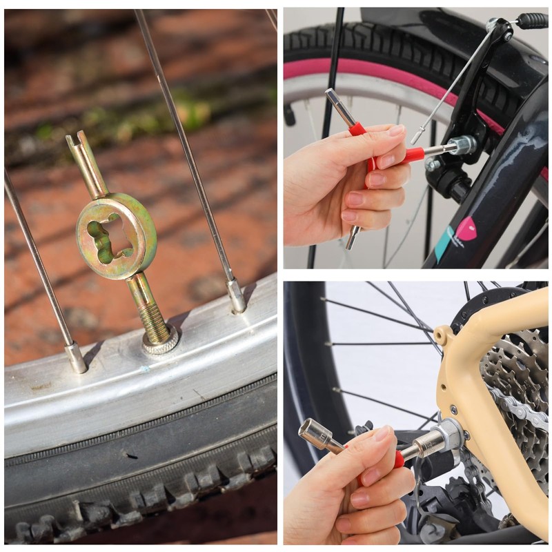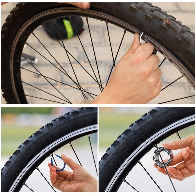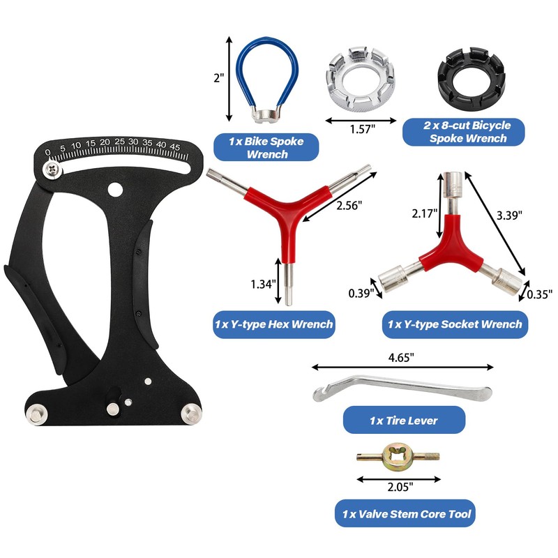 - Multi-Function: Spoke tension gauge is used to build or repair wheels, diagnose wheel problems. Spoke wrench is used to adjust bicycle spokes. 8-cut bicycle spoke wrench is used to adjust spokes on most kinds of push bike. The Y-type hexagon wrench is suitable for 4/5/6mm hexagonal screws, and the Y-type socket wrench is suitable for 8/9/10mm screws. Tire lever is used to replace bicycle tires. Valve core remover is applied for removing or installing valve cores