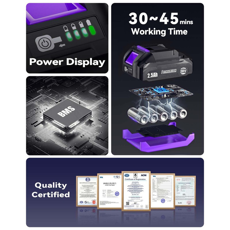 - [SmartBMS] Professionally certified battery with 14-layer Protection Matrix via advanced BMS. Each 2.5Ah battery supports actual work for 30-45 mins
