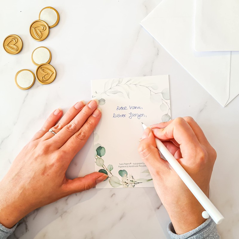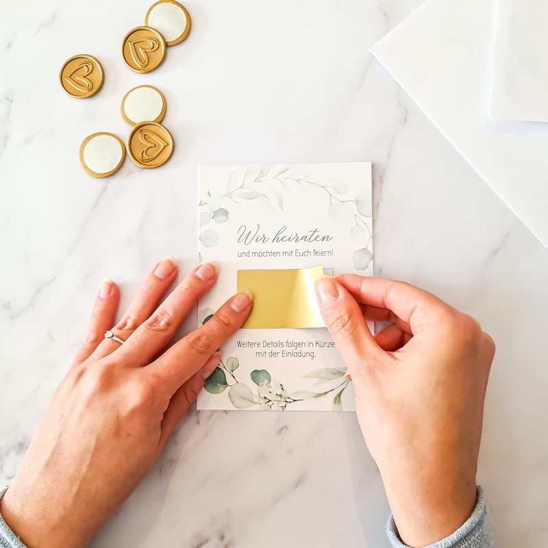 • Simply enter your name and wedding date into the bordered field (we recommend permanent markers or ballpoint pen) and stick the sticker over it. Then you can distribute the cards to your loved ones and surprise them with an invitation to your upcoming wedding party