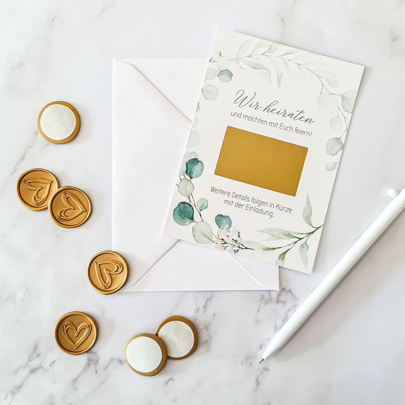 Suzu Papers Save the Date Cards Wedding Eucalyptus - Scratch Cards to Write on Yourself with Scratch Sticker and Envelope