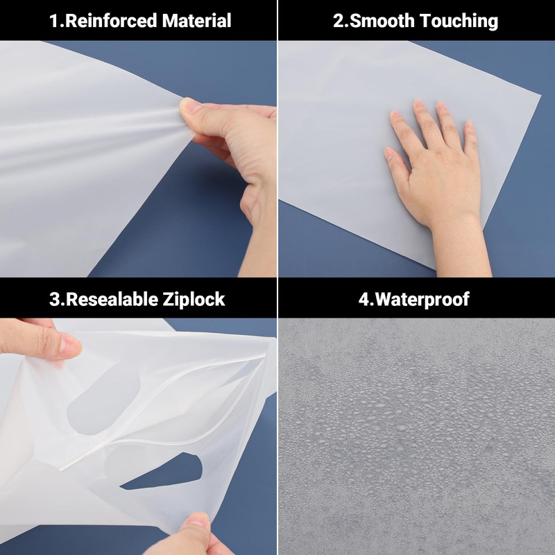 - Cierre con cierre hermético: nuestras bolsas de plástico con cierre hermético son fáciles de sellar instantáneamente y resellables, acelerando las operaciones de embalaje, envío y envío sin selladores adicionales o cinta, y protegen tu ropa y pertenencias del polvo, olores y humedad.
