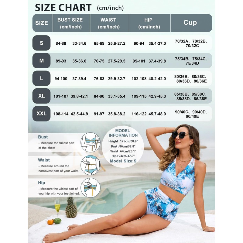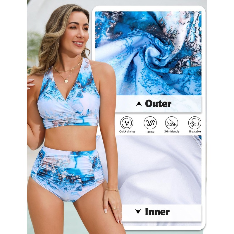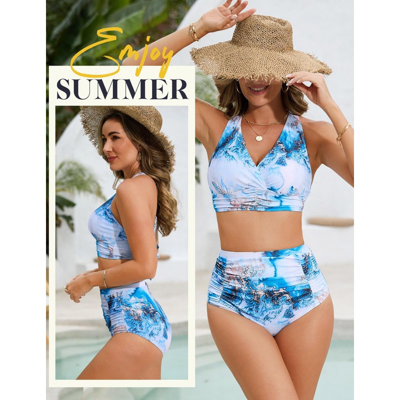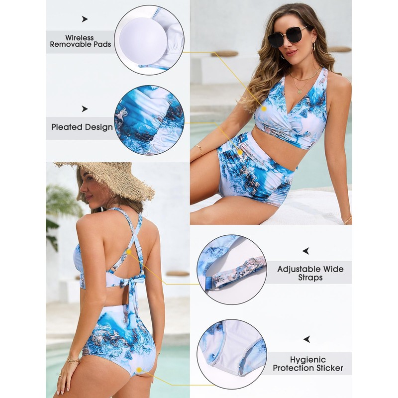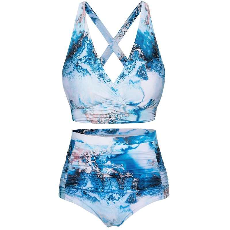 Svanco Women's Bikini Sets Triangle Bikini Push Up Criss Cross Top High Waisted Bottom Ruched Tummy Control Swim Suits for Beaches Blue Marbling M