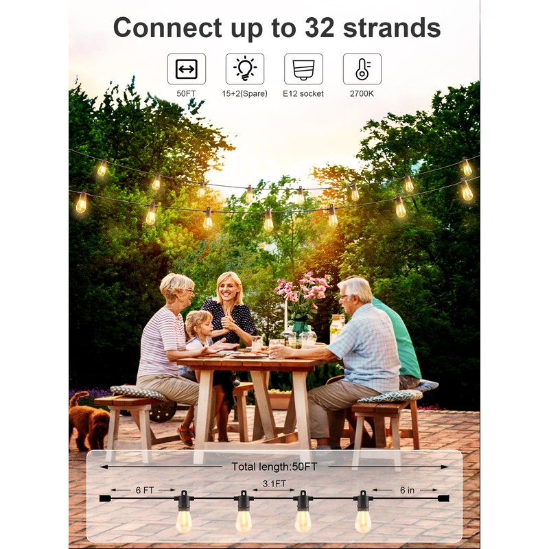 - Wide Application: Perfect for outdoor patio, cafe, bistro, backyard, yard, porch, gazebo, balcony, Outside, garden, party, wedding decoration. Connect up to 32 strands of 50 FT string lights. Please contact us if you have any problem