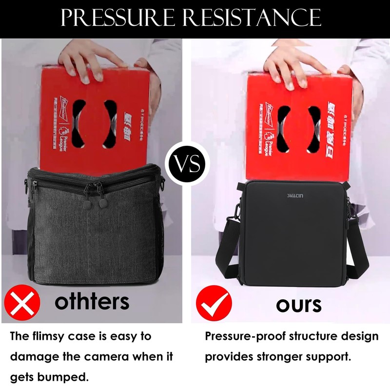 - Multi-layer Pressure-proof &Shockproof:The body a of the camera case was made of a sandwich structure. The center is hard PP plate material which plays the role of pressure resistance,support and dispersion of collision force. The inner and outer layers are soft PE foam that wraps the PP plate. They cooperate to upgrade the anti-collision level better, protect the camera, and even withstand 6.6 pounds of weight objects