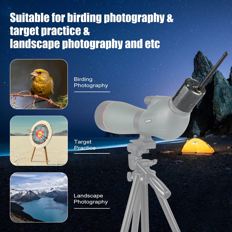 - SC001 WIFI electronic eyepiece can be connected to mobile phone or tablet computer; which can realize remote operation; suitable for birding photography; target practice; landscape photography and etc