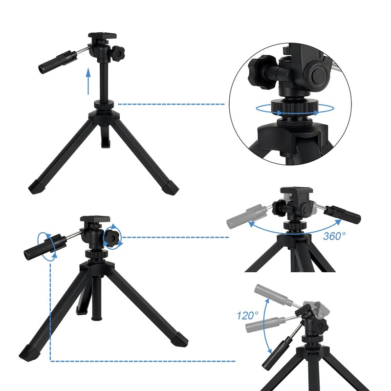 - SV146 tabletop tripod provide 360-Degree Horizontal Rotate and 120-Degree Vertical direction Rotate; rotate the locking ring counterclockwise to adjust the angel of head and clockwise to lock; It is convenient for you to adjust and watch from other angles