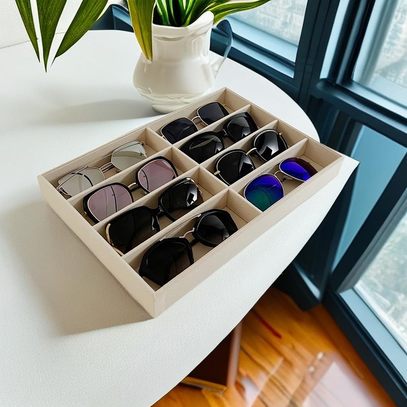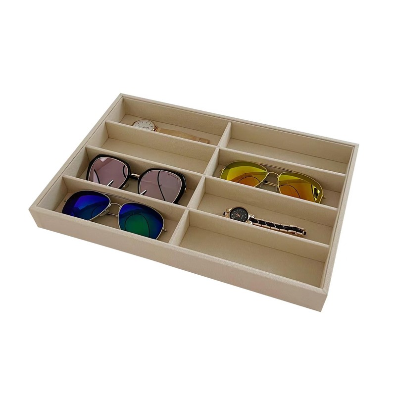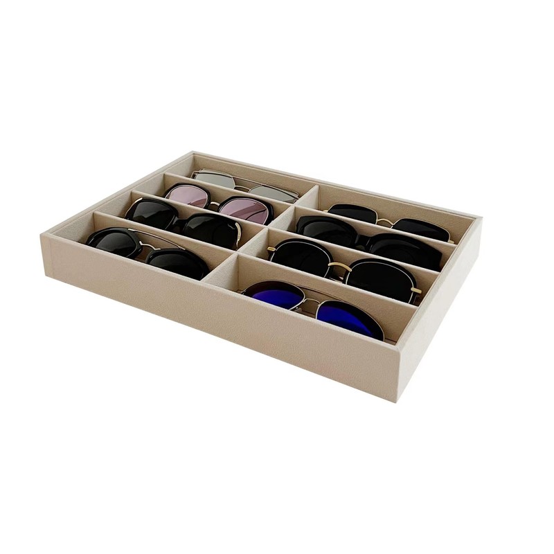 - FUNCTION: Multi-functional stackable sunglasses eyewear collection organizer tray. Also perfect to be used in closet or as drawer dividers. 8 grid tray.